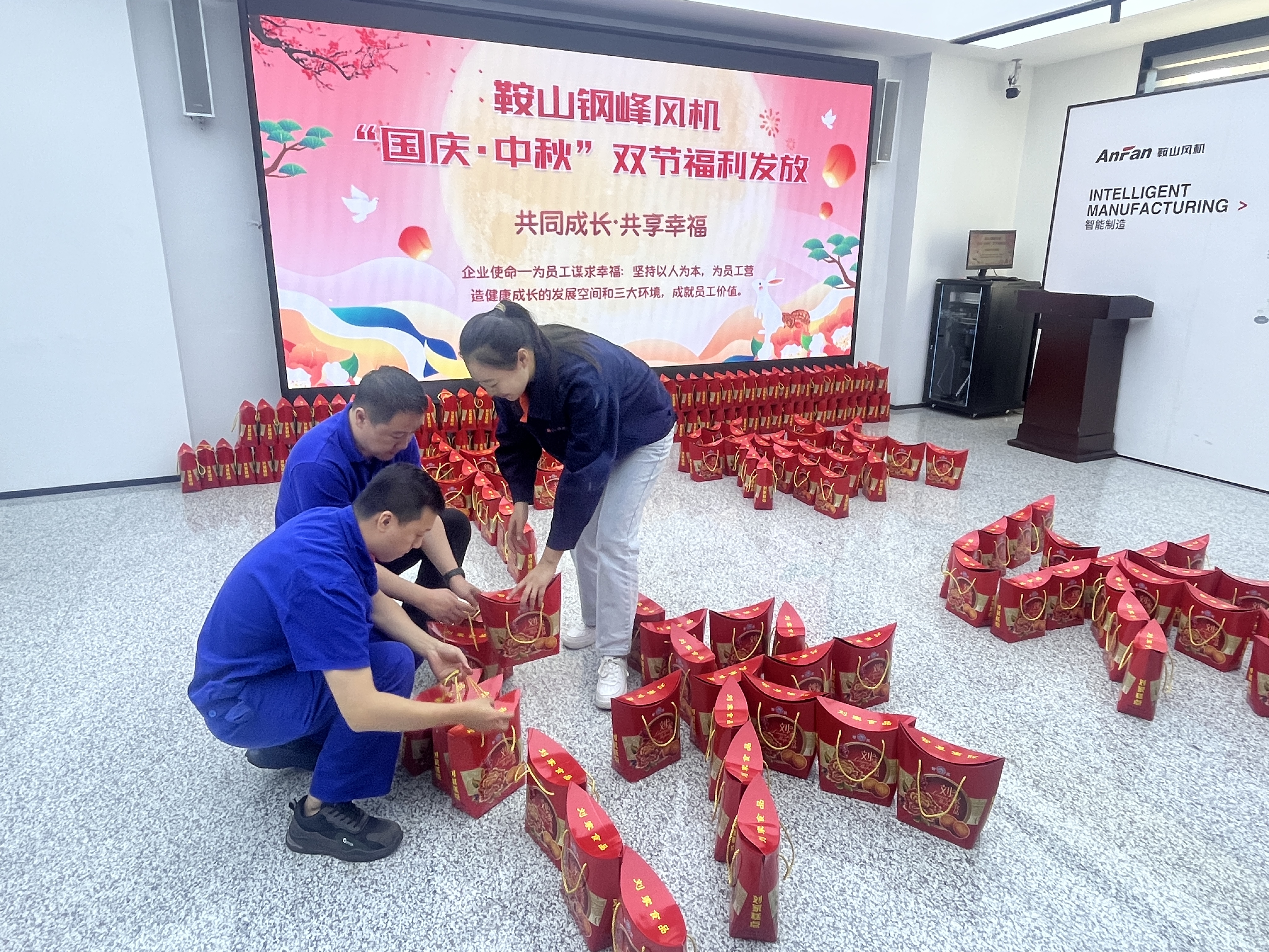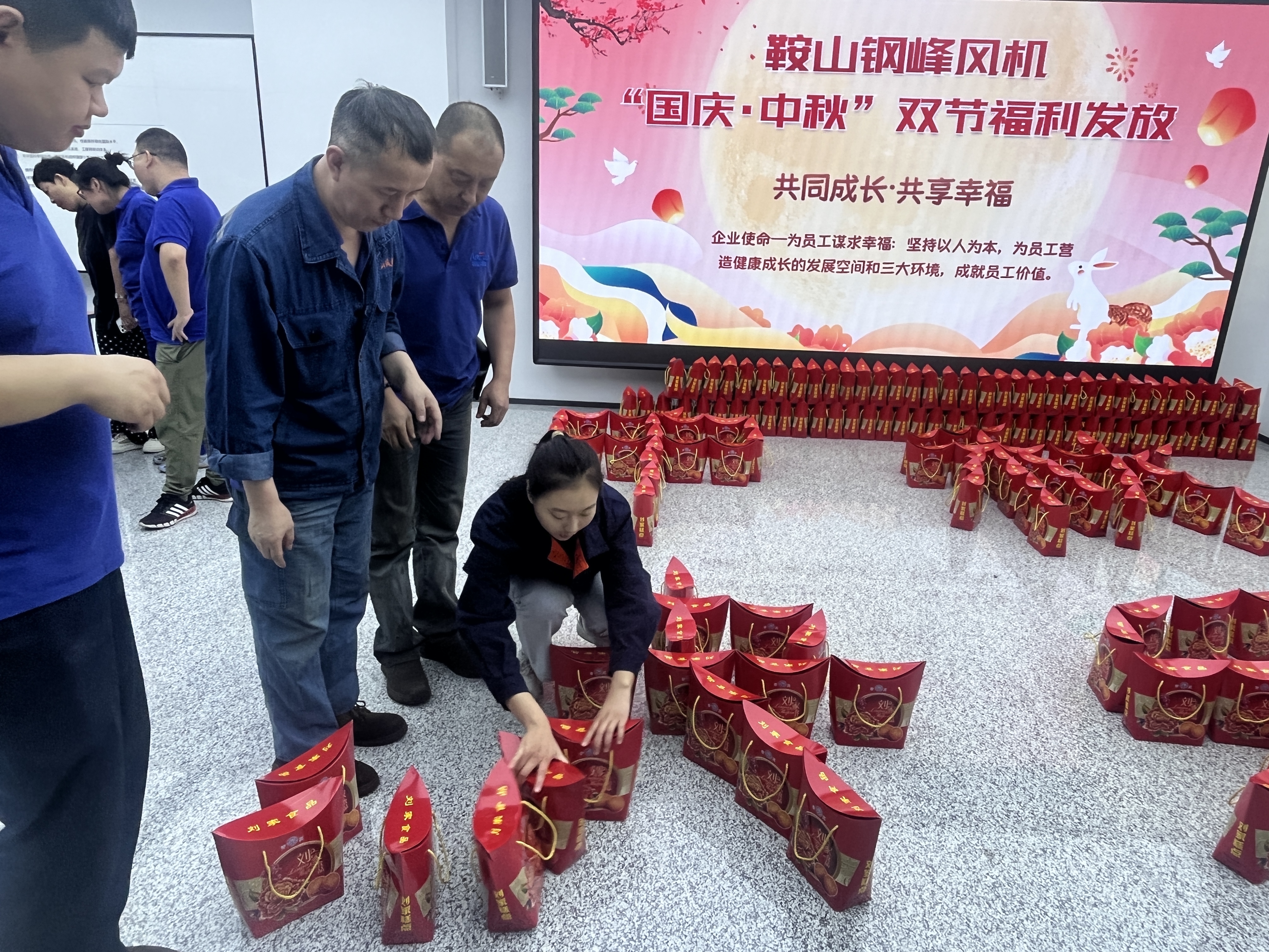 2023-09-22 00:00:00On the occasion of the Mid-Autumn Festival and the National Day, in order to express the company's care for every employee and thank all employees for their hard work, the labor union of Anshan Gangfeng Fan Co., Ltd. conducted a double-festival welfare distribution event to provide employees with Holiday wishes and gifts.